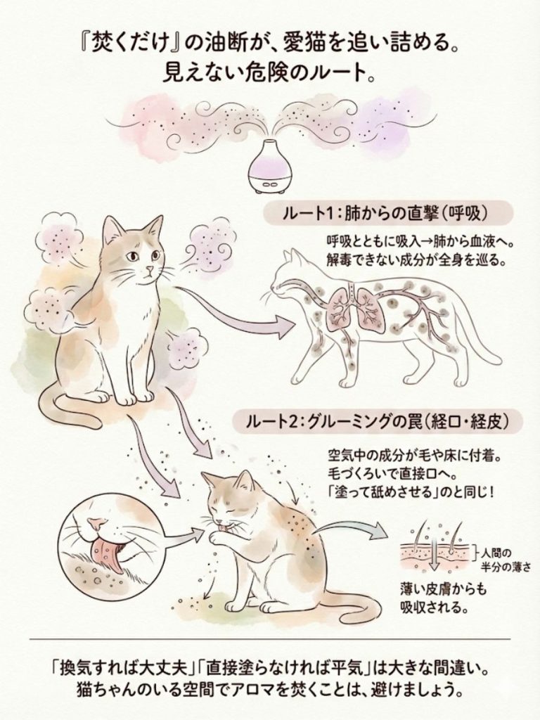 これが一番怖いです。空気中を漂ったアロマ成分は、やがて床や家具、そして猫ちゃんのフワフワの毛に降り注ぎます。猫ちゃんはキレイ好きですから、自分の体を舐めて毛づくろい(グルーミング)をしますよね?つまり、「空中にアロマを焚く」ことは、猫ちゃんの体に精油を塗りたくり、それを直接舐めさせているのと同じことなんです。人間の皮膚の半分ほどの薄さしかない猫の皮膚からも、成分はどんどん吸収されてしまいます。