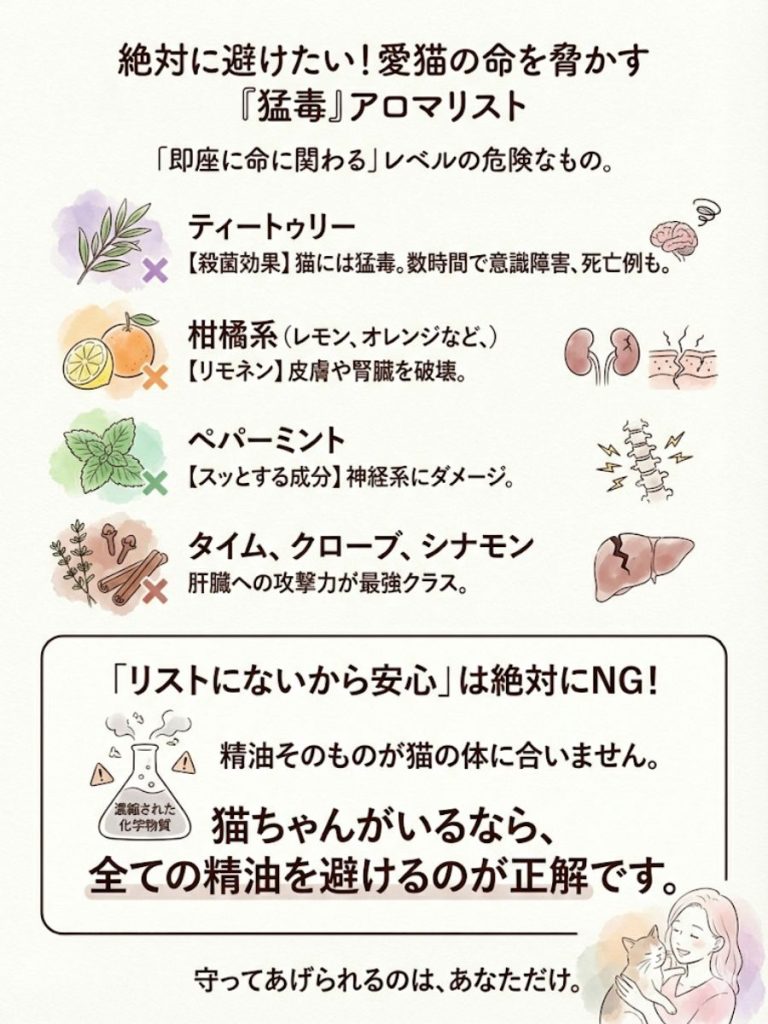 「このリストにないから安心」ではなく、「精油という濃縮された化学物質そのものが、猫には合わない」と覚えておいてください。