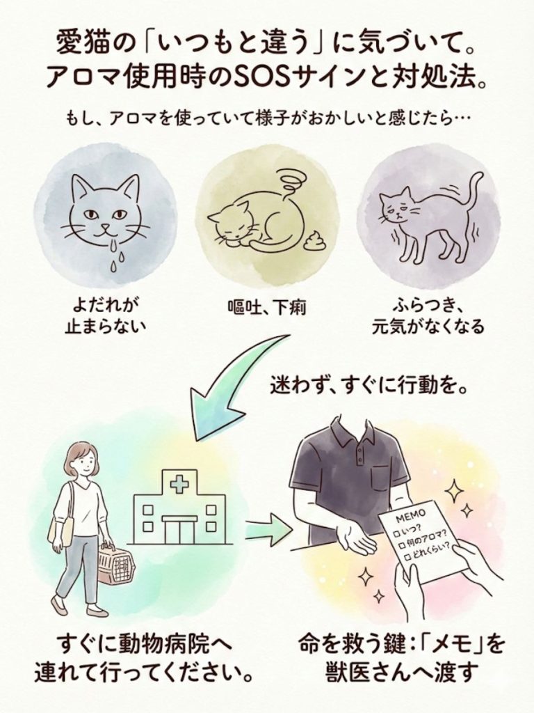 その際、「いつ、何のアロマを、どれくらい使ったか」をメモして獣医さんに渡すことが、命を救う鍵になります。