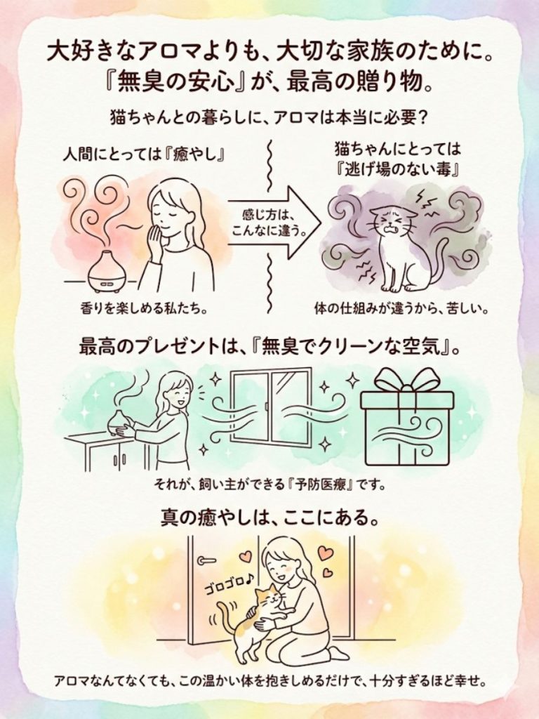 そして、大好きなアロマを自宅では我慢して、「無臭でクリーンな空気」を守ってあげること。
