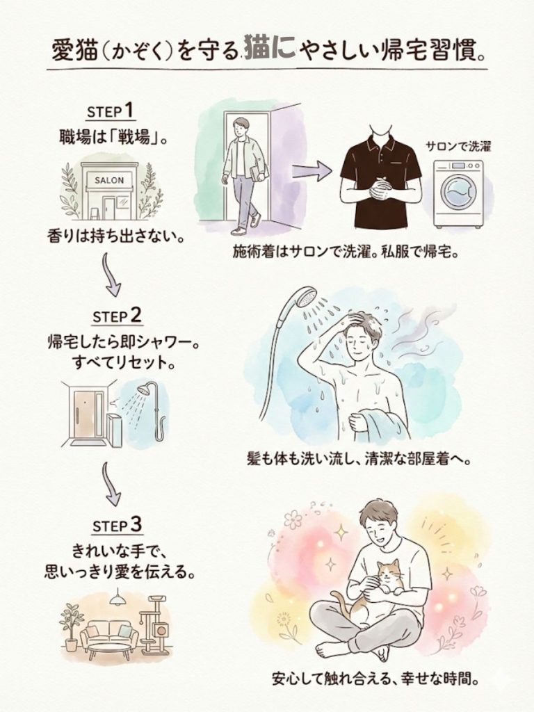 猫ちゃんと接する前に、服を脱ぎ、シャワーで髪や体に付いた香りを洗い流します。