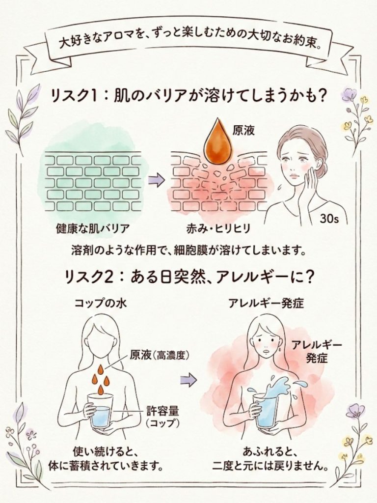 精油も同じです。植物のパワーが数百倍に濃縮された「原液」をそのまま肌に塗るのは、お肌にとっては「攻撃」になってしまうんです。