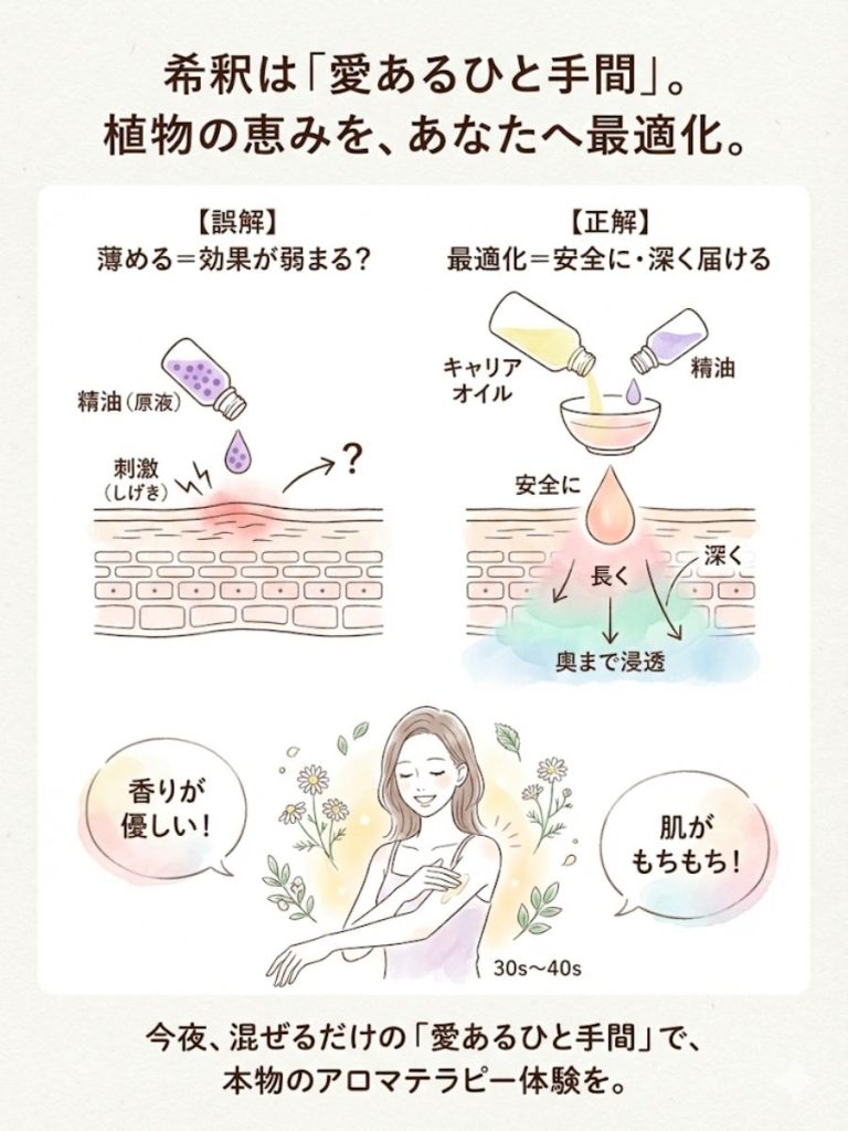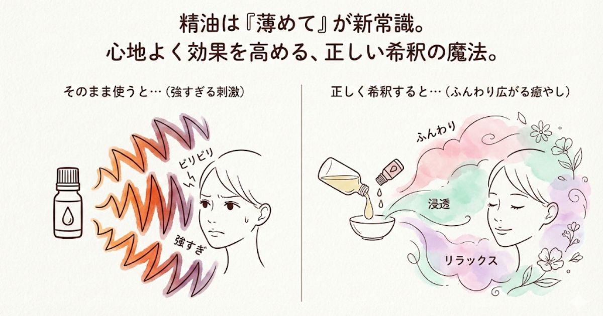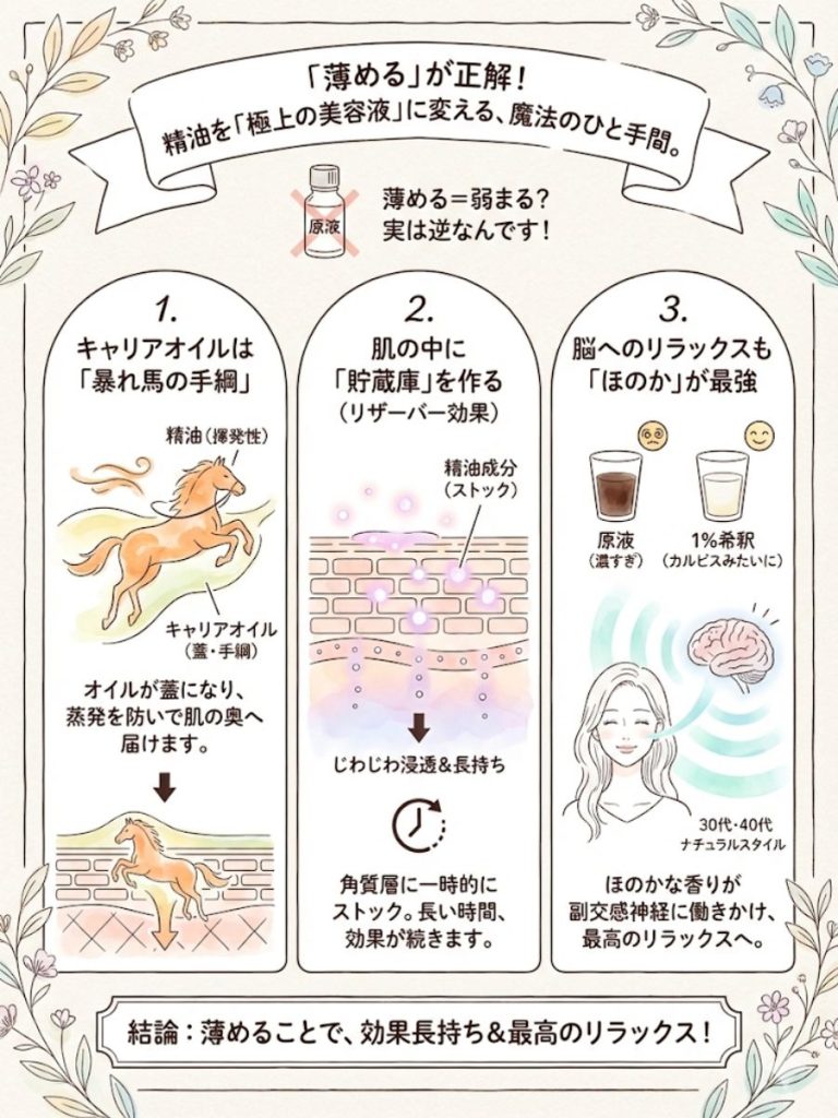精油を「薄める」ことこそが、その効果を最大限に引き出すプロの裏技なんですよ。