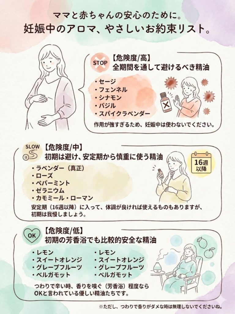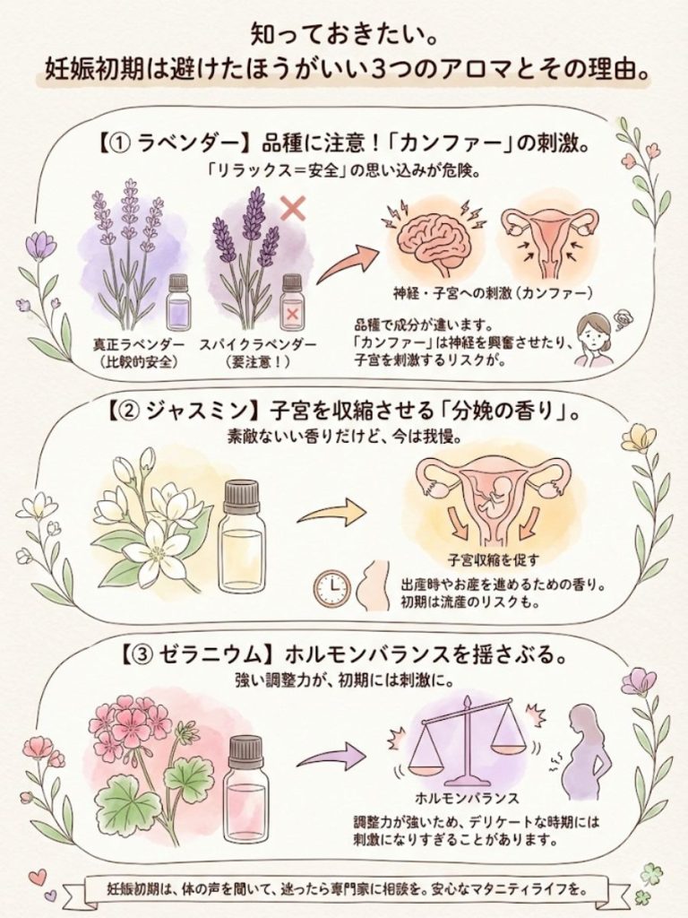 では、具体的にどのアロマに気をつけるべきか。特に「有名だけど、実は妊娠初期には危険」な3つをお伝えします。