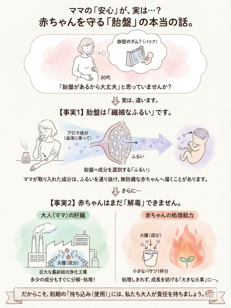 お母さんが吸い込んだり、肌に塗ったりしたアロマの成分は、血液に乗ってこの「ふるい」を通り抜け、まだ無防備な赤ちゃんの手足や脳へ届いてしまうことがあるんです。
